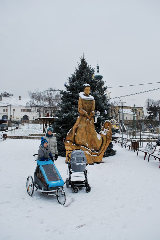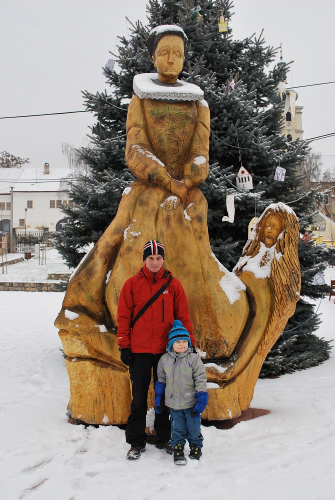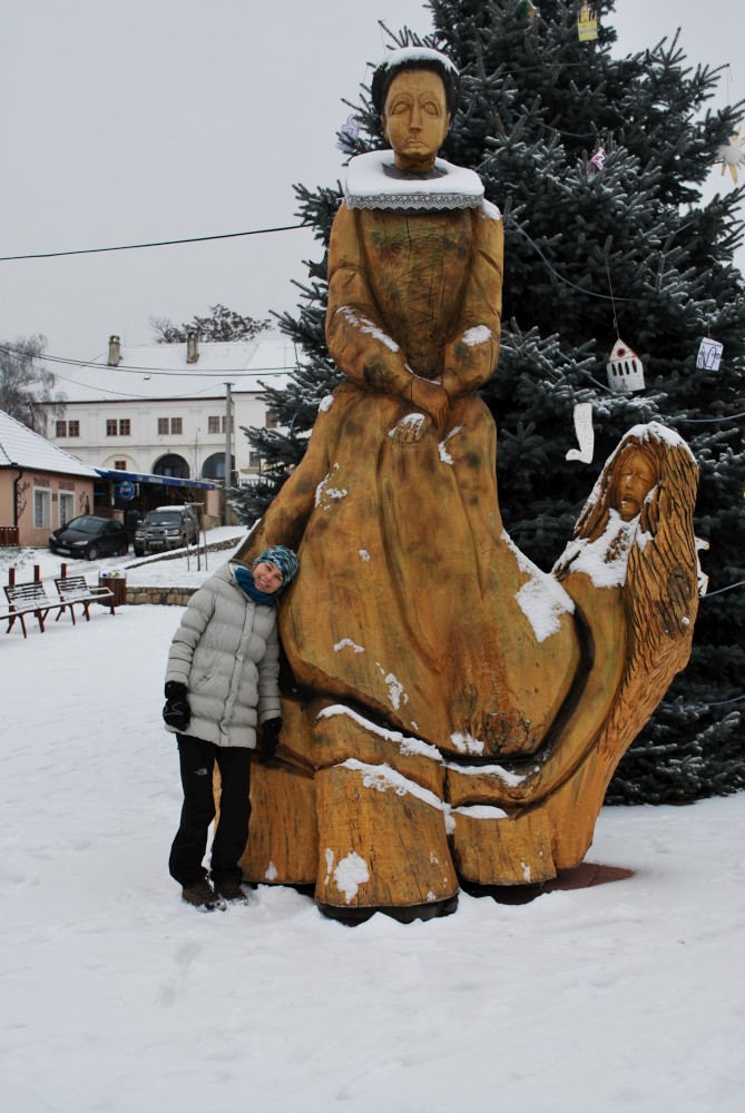 Od stanice je to do Čachtic docela kus, trvá nám to skoro půl hodiny. Fotíme se s dřevěnou Čachtickou paní a jdeme hledat restauraci na oběd. Po několika neúspěšných pokusech a s obavou, že to dopadne jako včera, nakonec nacházíme poměrně slušnou nekuřáckou pizzerii. Dáváme kapustnici, špagety, pizzu a vyrážíme na hrad.